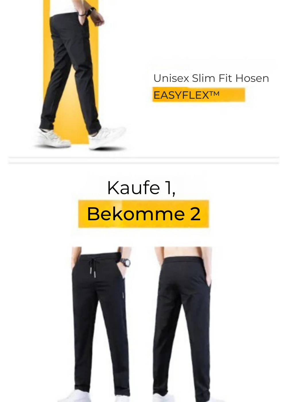 Beim Kauf der Slim Unisex EasyFlex™-Hose qualifizierst du dich automatisch für die "Kaufe 1, bekomme 2"-Promotion. Füge einfach das Produkt deinem Warenkorb hinzu und die zweite Hose wird kostenlos beim Checkout hinzugefügt.